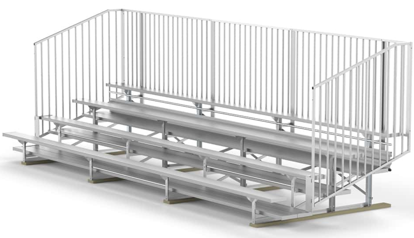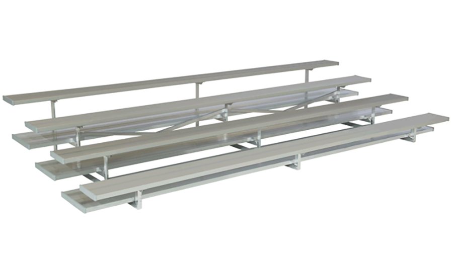 Here at Valley Athletics, we pride ourselves on providing you items of only the best quality. Compare these bleachers to other suppliers and you’ll find that their quality meets or exceeds any other bleacher in the country. Their manufacturer has over 35 years of experience, so you can be sure that you’re getting the highest quality available. These bleachers are made with all aluminum construction and a 204R1 anodized finish, so that you never have to worry about maintenance, rust, or corrosion, saving you valuable time and energy. They are fully welded to eliminate the liability of bolts working loose, as well as fitted aluminum channel end caps on all open ends eliminates sharp edges, because safety is important, whether it’s your fans or your players. Speaking of safety, the 10″ wide aluminum, mill finished 6063-T6 alloy seat planks and foot planks are ribbed to create a non-slip surface, preventing falls or injuries. Rows 1 through 3 of these bleachers have single foot planks, as well as double foot planks on row 4, and row 4 also boasts a double row riser. They seat 40 (15 foot size), 56 (21 foot size), and 72 people (27 foot size), and with their aluminum constructed, 6061-T6 alloy angled, fully welded, mill-finished understructure, these bleachers are sure to be durable and last season after season. Their 42″ high, two line guard rail system with 9 gauge wire mesh is fully enclosed starting at seat row 3 and above, and is attached with mill finished aluminum angle, keeping fans, students, and parents safe, while remaining tough and durable. Plus, you’ll have peace of mind when you purchase these bleachers, as they come with a 5 year manufacturer warranty against material defects and workmanship, as well as a 25 year guarantee on the anodized finishes. The manufacturer recommends anchoring all bleachers, and some assembly is required. Please allow 4 to 6 weeks for delivery.