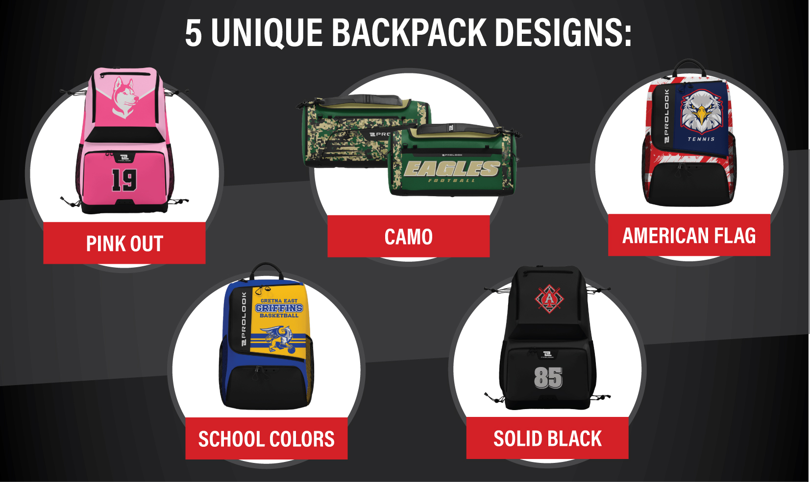 We here at Valley Athletics are all about giving you the best style, function, and high-performance at the best pricing, and this promotion is no exception! With the PROLOOK Bags Fundraising Promo, you have the potential to reach anywhere from 500 - 3,000 potential buyers per school, which could equate to thousands of dollars in fundraising for your school and its programs. The way it works is like this: the more bags your students buy at our discounted rate, the more money you earn for fundraising. For example: if you have 1,000 high school kids, 500 middle school kids, and 3,500 elementary kids, then there are 5,000 potential buyers. Even with a 10% buy rate, this means 500 bags would sell, which equates to $10,000 in fundraising. With 5 different styles (see below) and 3 different versatile designs (see below), there's a design and style every student is sure to love. Get your kids the backpacks they need while also raising funds for your school and its programs with this win-win of a promo!