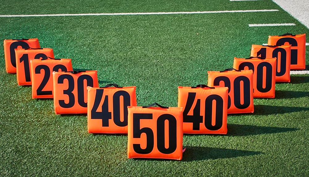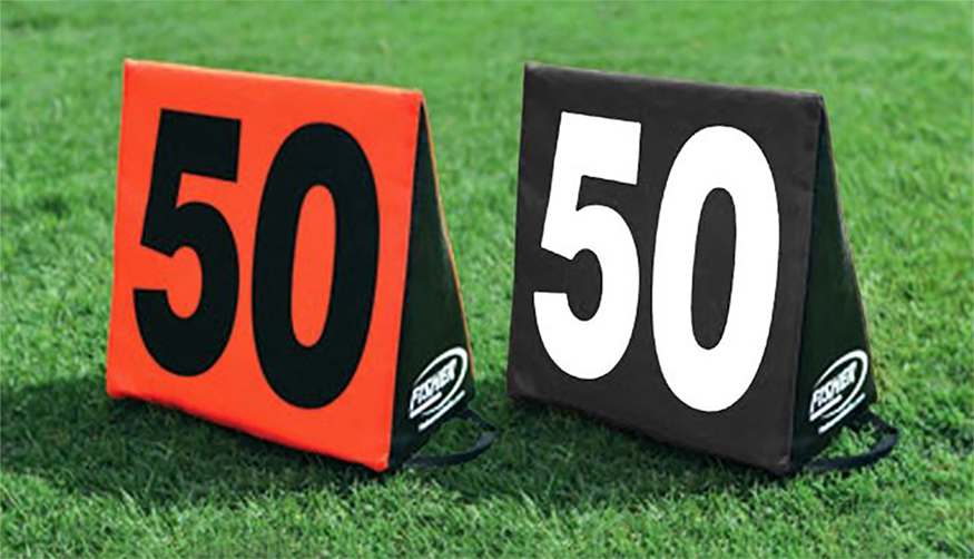 Make sure your team, coaches, and referees are evaluating their yardage the right way: with the best sideline markers in the industry! these triangular markers not only stand out well against the green of the field, but they feature a solid poly-foam interior with a heavy weighted base that stays in position, so that there’s not question of what line the ball ends up on. They’re covered with industrial grade 18 ounce vinyl-coated nylon that provides excellent tear resistance, so that they’ll stay looking their best for seasons to come! These sideline markers come with 12″ high numbers and are sold in a set of 11 (2 each of G-40 and 1-50) for 1 side of the field.